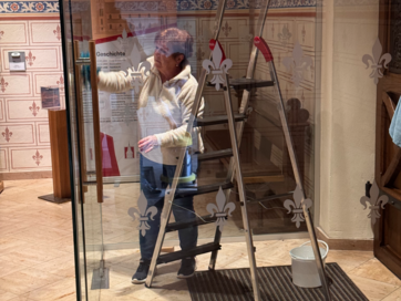Die Altäre, die Kanzel, die beiden Beichtstühle, der Kreuzweg und Figuren wurden vom Staub und Spinnenweben befreit, die Bänke abgewaschen, die Glaswindfänge gereinigt, die Heizungs- und Lüftungsschächte wurde ausgesaugt und mit neuem Flies ausgelegt. Die Fußmatten in den Eingangsbereichen wurden abgesaugt und die Lampen im Mittelschiff und im Altarbereich wurden gereinigt. Die Schriftenständer wurden gereinigt und die Liedbücher sowie das Informationsmaterial wurde wieder in die Schriftenständer einsortiert. Die Empore und das Treppenhaus zur Empore wurden in dieser großen Putzaktion auch geputzt.