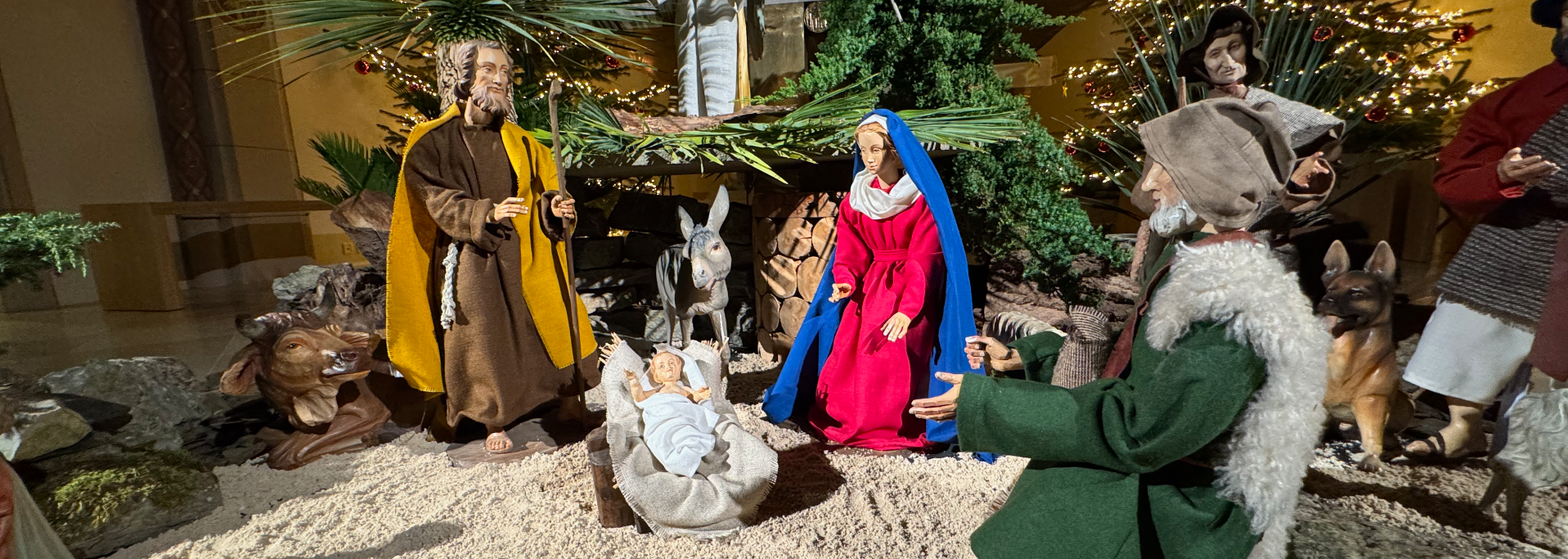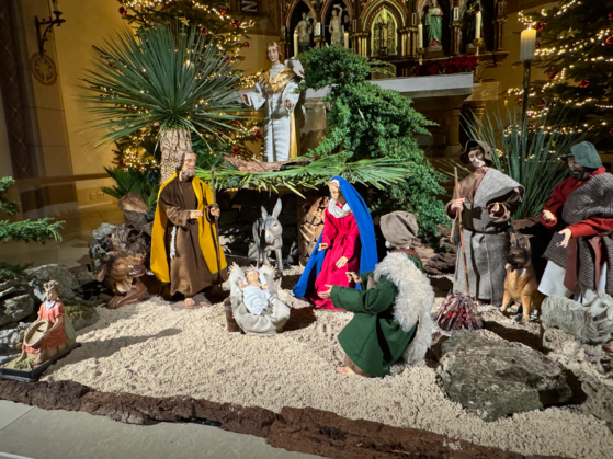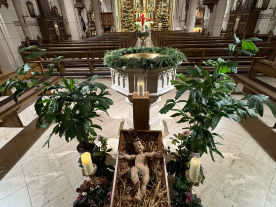 Seit Dezember 2021 wird die Krippenlandschaft mit ihren verscheiden Darstellung vor dem neuen Altar im Altarraum aufgebaut. Als Ergänzung steht vor dem Taufstein im hinteren Bereich der Kirche, für die Kirchenbesucher, eine große Krippe, in die in der Heiligen Nacht das Jesuskind hineinlegt, wird. Diese kleine Darstellung, mit dem Friedenslicht aus der Geburtsgrotte in Bethlehem, rundet das weihnachtliche Geschehen in unserer Pfarrkirche ab.