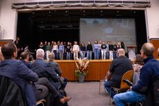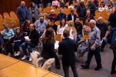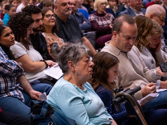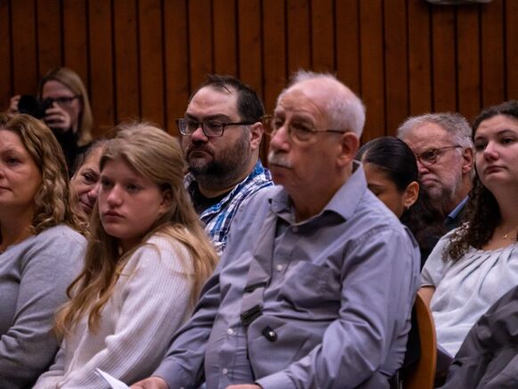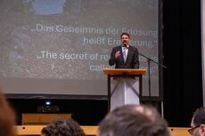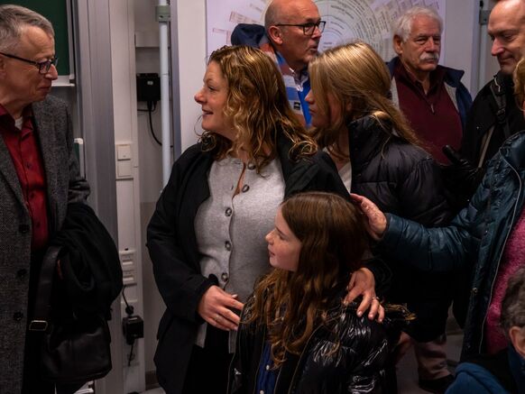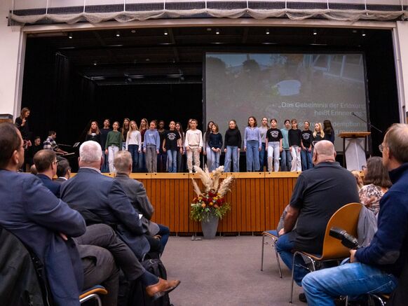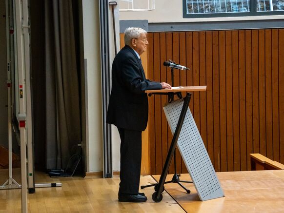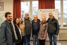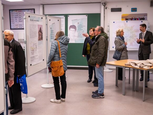 Und so war dieses Zitat auch im Hintergrund der Aula als Motto auf dem Foto der Gedenkstelen auf dem Schulhof in beiden Sprachen - Deutsch und Englisch - zu lesen. Die Zweisprachigkeit hatte einen ebenso guten wie schönen Anlass: Als die Familie Stern in New York von unserer geplanten Gedenkfeier am 9. November 2025 er-fuhr, kam in ihr der Wunsch auf, dieser auch persönlich beizuwohnen, und so reiste sie mit 17 Familienmitgliedern aus den USA an. Das war uns natürlich Verpflichtung, sie als unsere Gäste angemessen zu empfangen und eine würdige Gedenkfeier zu bereiten.