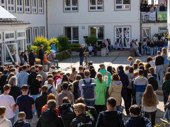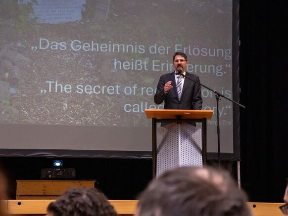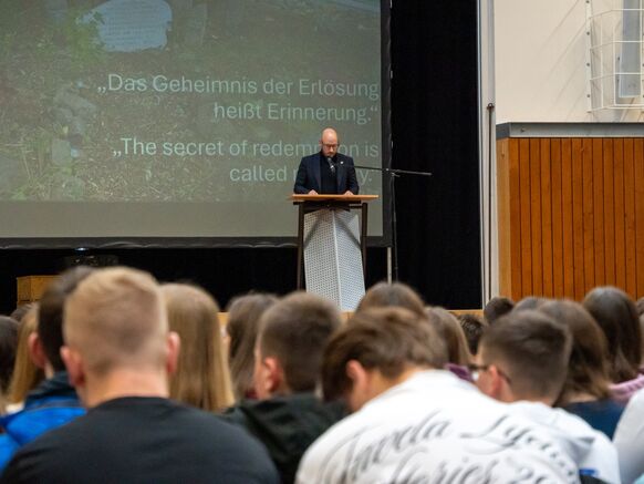 Der Landtagsabgeordnete Sebastian Sack erinnerte daran, dass Pogrome wie die Reichskristallnacht, wie sie verharmlosend genannt wird, und die Shoa nur durch Wegschauen und Schweigen der großen Masse möglich sind und fragte, wie wir uns verhalten hätten und spannte den Bogen zu unserem Wegschauen bei rassistischen oder nazistischen Sprüchen oder Memes in den Sozialen Medien. Das Wort Primo Levis »Es ist geschehen und folglich kann es wieder geschehen« war für ihn der Anlass, an die Schüler:innen, aber eigentlich an uns alle, zu appellieren: »So wünsche ich uns allen ein großes Herz und ein großes Mundwerk, den nötigen Mut sowie Solidarität und Menschlichkeit. Lasst uns alle immer und immer wieder laut sein, gegen jedwedes rechte Gedankengut und Handeln, lasst uns laut sein für die Menschlichkeit!«