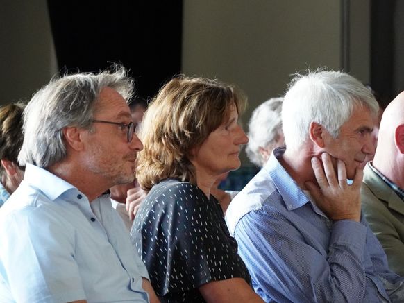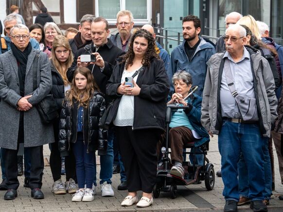 Diesem Sinn der Stelen gab auch der Schulseelsorger Paul Lang Ausdruck, indem er den Begriff des Denkmals auf seinen eigentlichen Aufforderungscharakter zu-rückführte: »Denk mal«! Und auch er wie alle anderen Redner erinnerten an die Bedeutung, die die Geschichte der Familie Stern nicht nur für die Schule, sondern auch für Amöneburg, aber vor allem auch für die Schülerinnen und Schüler hat. Der ehemalige Schulleiter Hans Gottschlich bezeichnete Familie und die Freundschaft Sterns als »Geschenk«; André Schlipp, der Bürgermeister Amöneburgs, begrüßte Sterns mit »Willkommen zu Hause«, Sterns blieben »ein Teil Amöneburgs« und gemahnte die zahlreichen Schüler:innen, dass Menschlichkeit zwar kein Schulfach sei, »aber vielleicht das Wichtigste, was man in der Schule lernen kann«: »Frieden beginnt nicht da draußen in der Welt – er beginnt hier. Auf diesem Schulhof dort draußen. In euren Köpfen. In euren Herzen.«