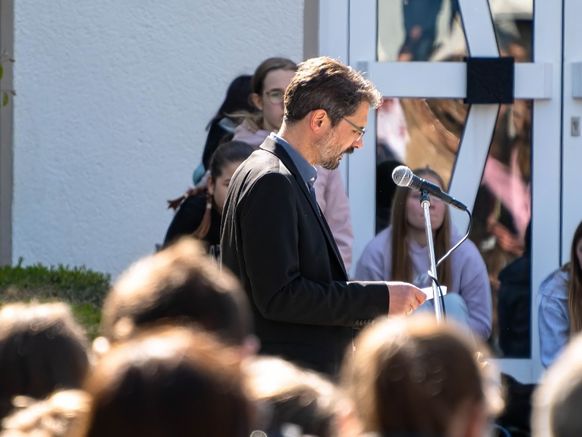 Nach einer musikalischen Eröffnung begrüßte Schulleiter Björn Mayr alles anwesenden Gäste — natürlich zweisprachig — und betonte die Bedeutung, die die Erinnerung an das geschehene Unrecht und die grauenhaften Verbrechen, für uns symbolisiert in der Familie Stern, sind, nicht nur für das Schulleben haben, sondern auch für die Gestaltung der Zukunft: »Erinnerung kann uns helfen, unsere Zukunft bewusst und menschlich zu gestalten […] Gerade vor diesem Hintergrund erhält Ihre heutige Anwesenheit, liebe Familie Stern, eine besondere Bedeutung. Sie verleiht unserem gemeinsamen Erinnern einen persönlichen Bezug.« So ist es uns als Schule Verpflichtung und Selbstverständlichkeit, die Gedenkstelen zu pflegen und — so wurde es während der Feier verkündet und durch Übergabe der Putzutensilien an 46 freiwillige und engagierte Schüler:innen symbolträchtig sichtbar — auch die Patenschaft für die Stolpersteine Amöneburgs, vor dem Schulgebäude und dem Schwesternheim, zu übernehmen und diese regelmäßig zu reinigen.