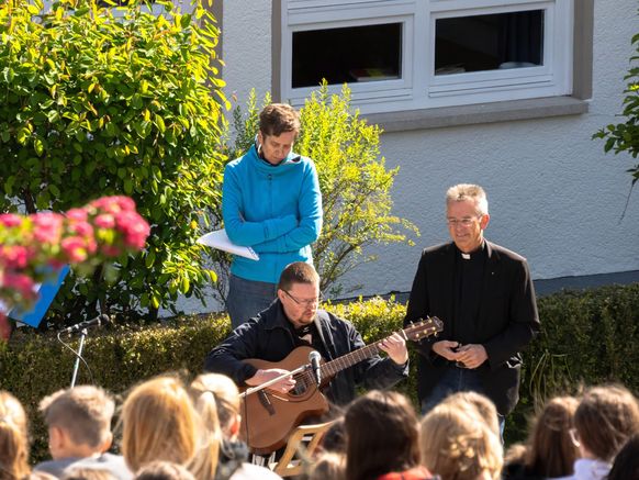 Um diesen besonderen Jahrestag angemessen zu würdigen, fand eine kurze Gedenkveranstaltung statt. Die Schülerinnen und Schüler der Jahrgangsstufe 7, die sich im Projekt Judentum näher mit Familie Stern beschäftigen, begannen die Gedenkveranstaltung mit einem Gottesdienst in der Kapelle des Rabanushauses. Anschließend versammelte sich die gesamte Schulgemeinde auf dem unteren Schulhof zur Gedenkveranstaltung.