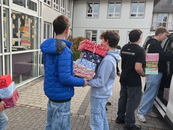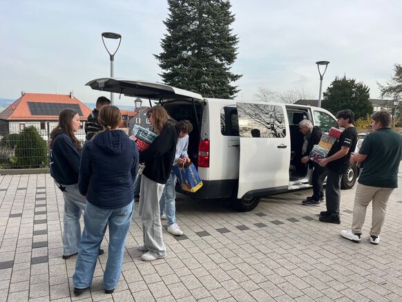 Mit tatkräftiger Unterstützung der Klasse 9B wurden die Geschenke in den Transporter eines freiwilligen Helfers verladen. Von dort aus treten sie ihre Reise nach Sibiu in Rumänien an, wo sie rechtzeitig vor Weihnachten Freude und Hoffnung schenken werden.
