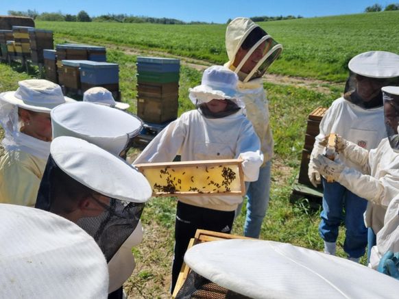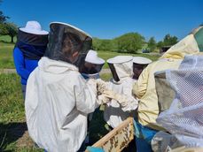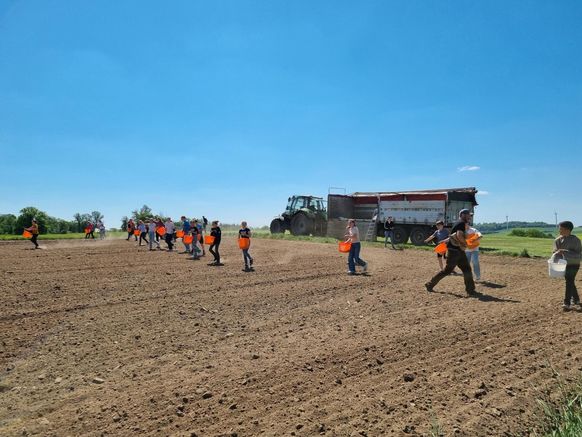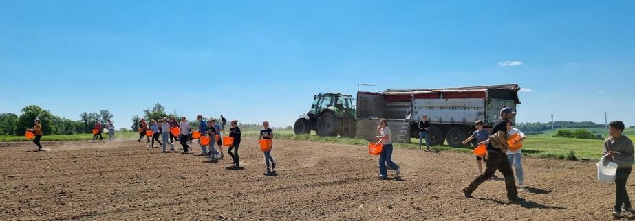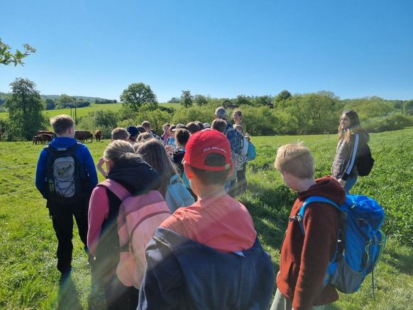 Zuerst sind wir zu den Mutterkühen auf die Weide gegangen, es waren auch Kälbchen dort. Die Kälbchen dürfen bei den Mutterkühen bleiben und auch ihre Milch trinken. Danach haben wir uns in zwei Gruppen eingeteilt. Die erste Gruppe durfte mit Herrn Steinbach auf die Felder und hat etwas zum Thema Ackerbau gelernt. Wir haben uns Klee und Buchweizen angeschaut. Die zweite Gruppe durfte mit Frau Steinbach zu den Bienen gehen. Wir mussten alle einen Imkerschleier tragen, da man sonst manchmal auch gestochen wird. Frau Steinbach hat uns dann einen leeren Bienenstock mit allen Räumen gezeigt, also mit Brutraum und Honigraum. Das war sehr spannend! Kurz darauf durften wir auch den Honig probieren, er war sehr lecker! Schließlich sind wir alle zusammen auf dem Hänger des Traktors zum Feld gefahren und haben einen Acker eingesät. Anschließend haben wir noch eine Rindswurst vom Otterbacherhof gegessen und Fußball gespielt. Wir haben an diesem Tag sehr viel gelernt, zum Beispiel wie wichtig Bienen sind, wie bedeutend die Standortfaktoren in der Landwirtschaft sind und was man beim ökologischen Ackerbau so beachten muss.