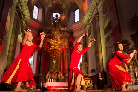 Fulda. Am Pfingstwochenende fand in der Fuldaer Stadtpfarrkirche eine „getanzte Vesper“ statt, an der über 200 Besucher teilnahmen. Unter dem Leitwort „Aus dir strömt Leben, Licht und Glut” wurde das liturgische Abendgebet der Kirche gestaltet, in das Musik, Sprache, Tanz und Licht einflossen. Idee und Konzept entwickelte die Tänzerin und Choreographin Dorothée Bretz aus Fulda, die zusammen mit den Tänzerinnen Laila Clematide (Düsseldorf) und Verena Piwonka (Kassel) die darstellerischen Parts übernahm. Die musikalische Gestaltung übernahmen Prof. Hans-Jürgen Kaiser (Orgel), Olaf Pyras (Schlagwerk) und Gudrun Stute (Gesang). Das Lichtdesign kreierte Benedikt Kaiser. „Eine klare Liturgie, gefüllt durch diese Elemente von Musik, Licht und Tanz nehmen uns mit hinein in das Pfingstgeschehen“, erläuterte Dechant Stefan Buß aus Fulda, der diesem besonderen Vespergebet vorstand.