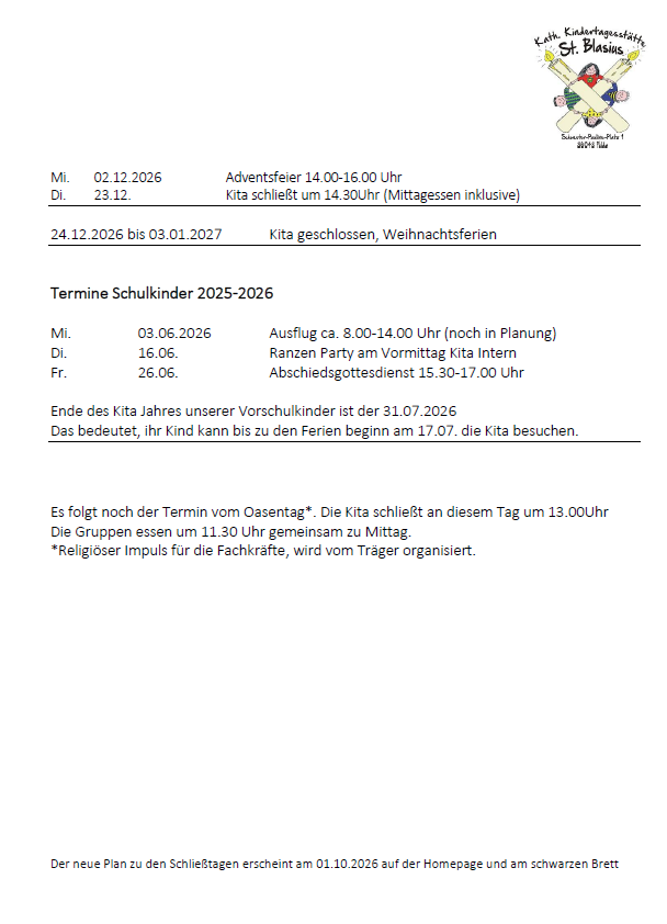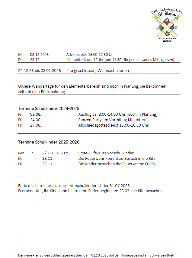 Feste Schließzeiten der Kita sind in jedem Jahr die letzte drei Wochen der Hessischen Sommerferien und die Tage zwischen Weihnachten und Silvester. Alle weiteren Schließtage entnehmen sie bitte dem aktuellen Kalender.
