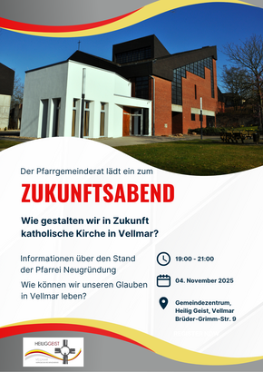 Am 02.03.2025 wird es zu dem Thema „Neugründung der Pfarrei“ nach dem Gottesdienst (ca. 11:30 Uhr) eine Pfarrversammlung im Gemeindezentrum Heilig Geist, Vellmar geben.